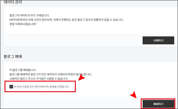 티스토리 블로그를 폐쇄하면 데이터가 모두 삭제되어 복원이 불가능할 뿐만 아니라 해당 블로그 주소도 5일간 사용할 수 없다고 하니 신중해 주세요~