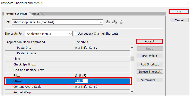 (저는 Stroke메뉴의 단축키를Ctrl+/로 지정해 보았습니다.)