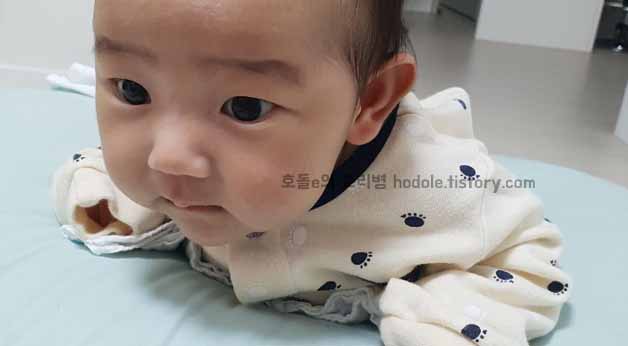 미국소아과협회에서는 부모가 지켜보는 가운데 잠깐씩 터미 타임(엎드려놓기)을 해주면 아기 머리가 납작해지는 것을 예방하는데 도움이 된다고 했습니다. 아직 목을 가누지 못하는 아기라면 엄마 가슴 위에 아기를 엎드려 놓고 엄마가 아기의 상체를 살짝 들어주는 것도 좋습니다.