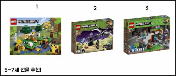 마인크래프트를 좋아하는 아이라면 마인크래프트 레고 어떠세요? 아이와 함께 고르거나, 아이가 원하는 컨셉의 레고를 미리 파악해두면 좋겠죠?