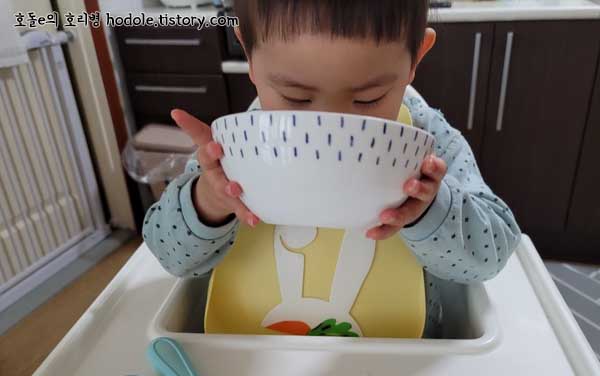 보기에는 쫌(많이) 그렇지만 24개월 아기에게 먹여보았습니다. 만들기 전에 떡국 만들어준다고 했더니 계속 "떠꾹~떠꾹~"노래를 하고 다니네요.
