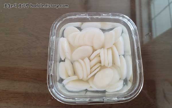 1. 냉동실에 얼려둔 떡국떡을 물에 담가 30분 정도 해동해줍니다. 저는 냉동 소고기도 함께 해동해두었습니다.