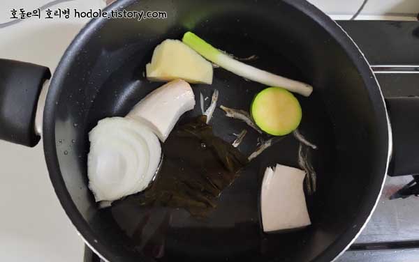 - 육수재료: 멸치, 자투리 야채들(양파, 대파, 애호박, 다시마, 버섯, 사과)