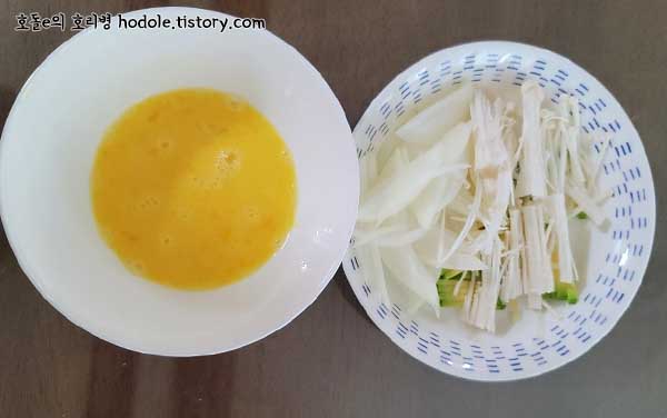 3. 계란을 풀고 양파, 애호박은 채 썰고 팽이버섯은 적당히 썰어둡니다. 야채는 그냥 냉장고 파먹기 용으로 준비합니다.