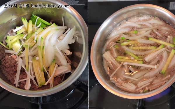 5. 야채를 넣고 아까 만들어준 육수를 부어줍니다. 팽이버섯은 나중에 넣는 게 좋겠지만 귀찮은 저는 그냥 한꺼번에 넣어줍니다. 그래도 아기는 잘 먹으니까요........