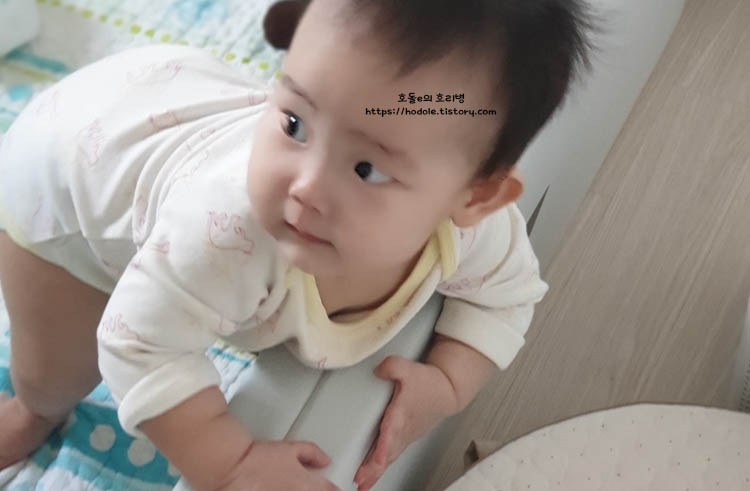 ※안전사고에 유의하세요! 주변에 다칠 위험이 있는 물건은 미리 치워두고, 아이가 잡고 서다 뒤로 넘어질 때를 대비해서 늘 아기를 잡을 준비를 하고 있어야 합니다.