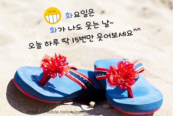 - (화요일 인사말) 화요일은 화가 나도 웃는 날~ 오늘 하루 딱 15번만 웃어보세요^^ 즐거운 하루 보내시길 바라겠습니다.