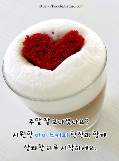 - 주말 잘 보내셨나요? 다시 힘차게 걸어가야 할 월요일입니다. 시원한 아이스커피 한잔과 함께 상쾌한 하루 시작하세요.