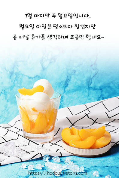 - 주말이 순식간에 지나가고 벌써 7월 마지막 주 월요일입니다. 월요일 아침은 평소보다 힘겹지만 곧 떠날 휴가를 생각하며 조금만 힘내요~