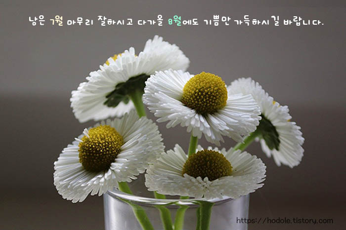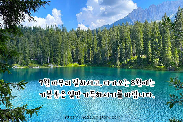 - 어느덧 칠월의 마지막 날입니다. 매월의 마지막 날은 참 아쉽지만 다가올 8월이 기대되고 설레기도 합니다. 7월 마무리 잘하시고, 다가오는 8월에는 기분 좋은 일만 가득하시기를 바랍니다.