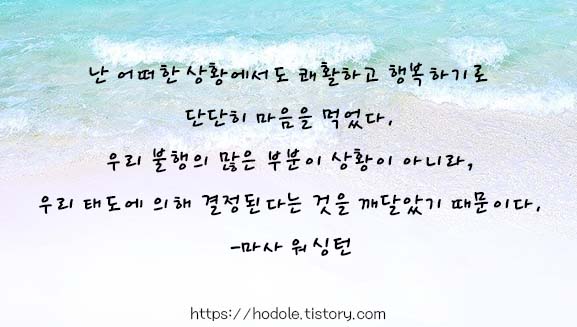 - 난 어떠한 상황에서도 쾌활하고 행복하기로 단단히 마음을 먹었다. 우리 불행의 많은 부분이 상황이 아니라, 우리 태도에 의해 결정된다는 것을 깨달았기 때문이다. -마사 워싱턴