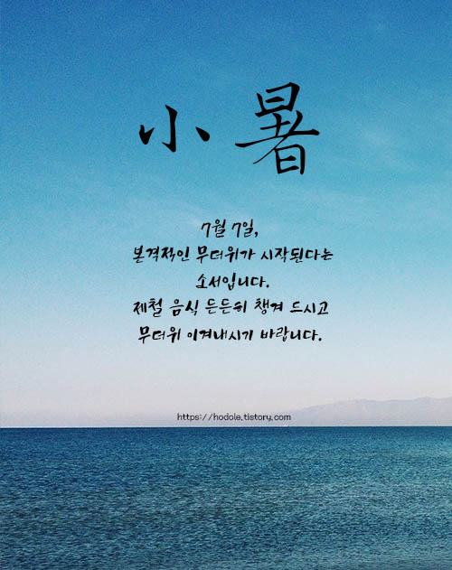 - (소서 인사말) 7월 7일, 오늘은 본격적인 무더위가 시작된다는 소서(小暑)입니다. 제철 음식 든든히 챙겨 드시고 무더위 이겨내시기 바랍니다.