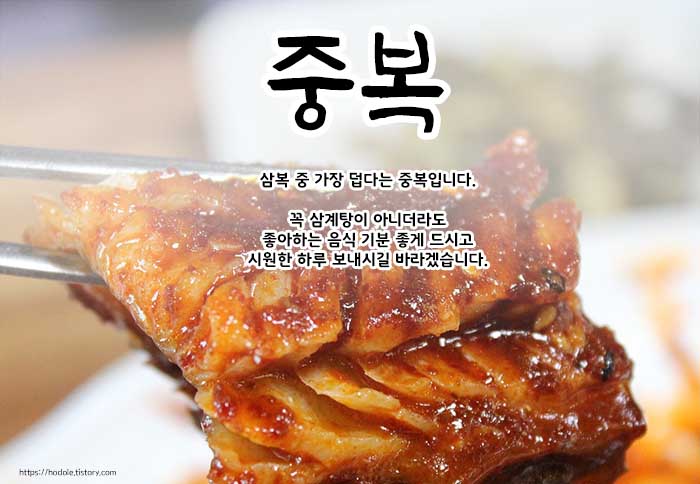 3. 삼복 중 가장 덥다는 중복입니다. 꼭 삼계탕이 아니더라도 좋아하는 음식 기분 좋게 드시고 시원한 하루 보내시길 바라겠습니다.
