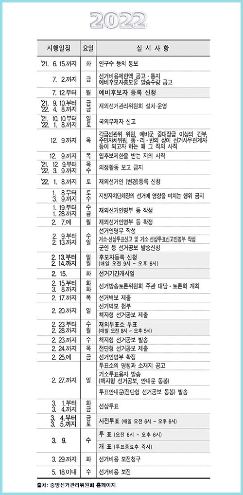 - 22.3.9 투표(오전 6시 ~ 오후 6시)/개표(투표 종료 후 즉시)