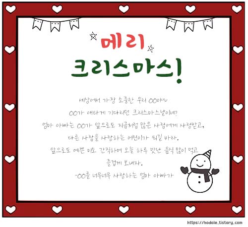 8. (부모님이 아이에게) 세상에서 가장 소중한 우리 OO야~ OO가 애타게 기다리던 크리스마스날이네? 엄마 아빠는 OO가 앞으로도 지금처럼 많은 사람에게 사랑받고, 다른 사람을 사랑하는 어린이가 되길 바라. 앞으로도 예쁜 미소 간직하며 오늘 하루 맛난 음식 많이 먹고 즐겁게 보내자. -OO를 너무너무 사랑하는 엄마 아빠가