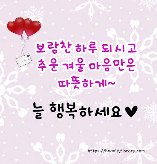 - 강추위 바람이 매서운 월요일 아침이에요. 주말 잘 보내셨나요? 반복되는 일상이지만 좋은 사람들과 함께라서 행복합니다. 선물 같은 하루, 행운으로 가득한 한 주 되세요.