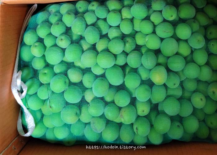 6월 초중순경에 나오는 매실은 껍질이 파랗고 과육이 단단한 '청매'이며 하순경 나오는 매실은 노랗게 익은 '황매'입니다.