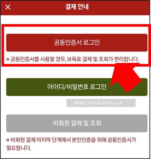 ④로그인 화면이 나옵니다. 공동 인증서로 로그인하는 게 여러모로 편리합니다. 인증서가 등록이 안되어있다면 등록을 해주세요.