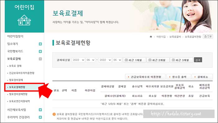 어린이집 > 보육료 결제 > 보육료 결제 현황에서 그동안 결제한 내역을 확인하실 수 있습니다.