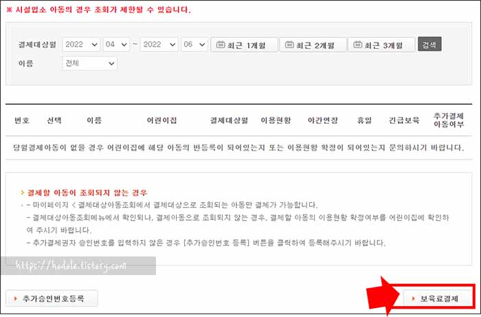 ③ 보육료 결제 화면이 나오면, 결제 대상 아동을 선택한 후, 하단의 보육료 결제 버튼을 클릭합니다.