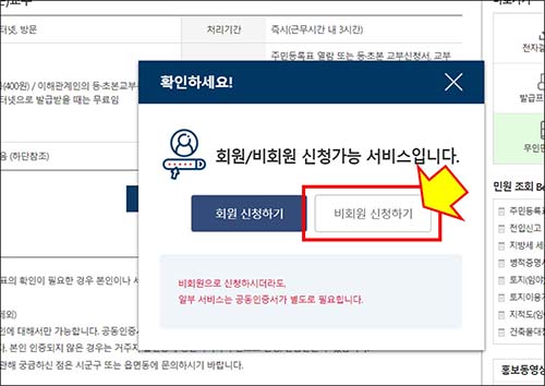 회원/비회원 선택창이 뜹니다. 비회원으로도 해당 서비스는 이용할 수 있습니다. (단 간편 인증 또는 공인인증이 가능해야 함) 저는 비회원 신청하기를 클릭하겠습니다.