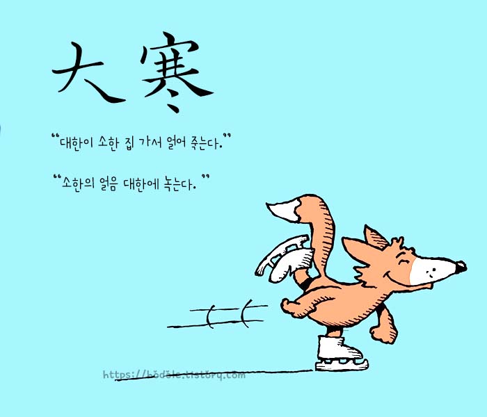 24절기 중 마지막 절기인 대한은 큰대(大) 찰한(寒)자를 써서 '큰 추위'라는 의미를 지니고 있습니다. 그런데 실제로 우리나라 날씨는 '작은 추위' 소한이 더 춥습니다. 이는 각 절기의 이름이 중국 춘추전국시대 중심이었던 황하강 지방의 기후에 맞춰 지어졌기 때문입니다. 우리나라 기후와는 맞지 않는거죠~