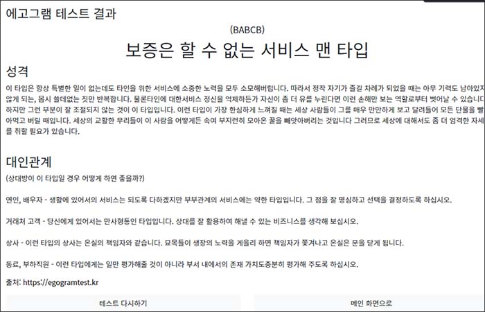 명확한 결과를 보기 위해선 가능하면 '중간쯤'은 선택하지 않는 것이 좋답니다. 50가지 문항에 모두 체크하면 결과가 나옵니다. 저는 (BABCB)(보증은 할 수 없는 서비스 맨 타입)이 나왔습니다.