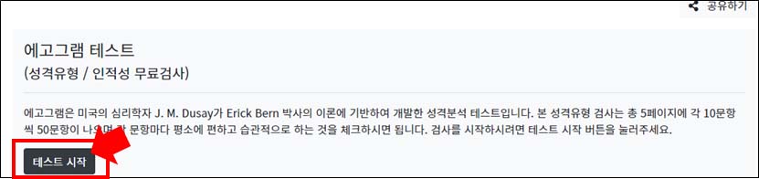 많이 알려진 에고그램 테스트 사이트 https://egogramtest.kr 에 접속하여 '테스트 시작'버튼을 누릅니다.