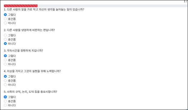 그럼 테스트할 수 있는 화면이 나오는데요. '그렇다''중간쯤''아니다' 셋 중 하나를 선택하면 됩니다. 저도 궁금해서 한 번 해봤답니다.